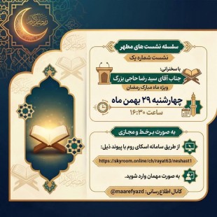به گزارش روابطعمومی مجتمع پسرانه علوم و معارف اسلامی شهید مطهری(ره) یزد، نشست «مطهر ۱» ویژه ماه مبارک رمضان با سخنرانی جناب آقای سید رضا حاجی بزرگ، در روز چهارشنبه ۲۹ بهمنماه ساعت ۱۶:۳۰ برگزار شد.